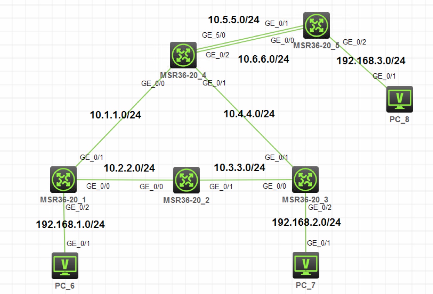 192.168.1.0/24网段到达192.168.2.0/24网段经过 R1,R2,R3192.168.2.0/24网段到达192.168.1.0/24网段经过 R3,R4,R1192.168.1.0/24网段到达192.168.3.0/24网段经过 R1,R4,R5192.168.2.0/24网段到达192.168.3.0/24网段经过 R3,R4,R5192.168.3.0/24网段到达192.168.1.0/24网段和192.168.2.0/24网段的路由来回一致- R5 上不允许出现到达其他业务网段的明细路由
