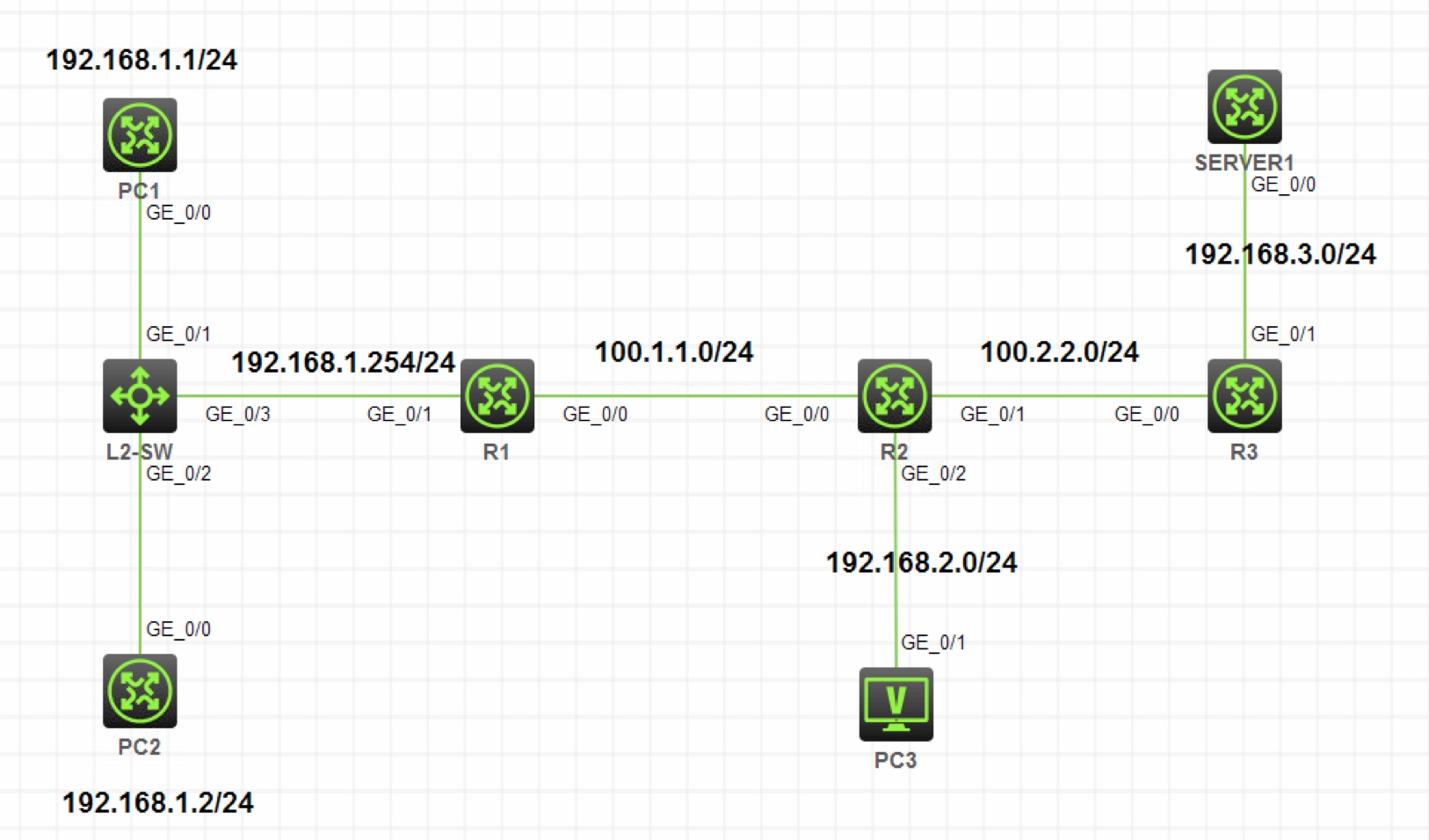 192.168.1.0/24网段,则其 IP 地址为192.168.1.3/24,以此类推。此拓扑中 PC1,PC2,SERVER1 使用路由器来模拟
