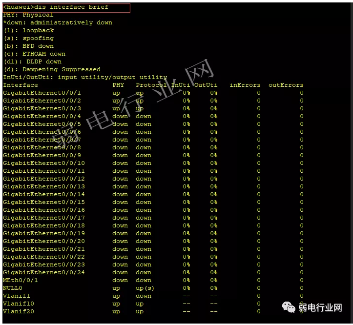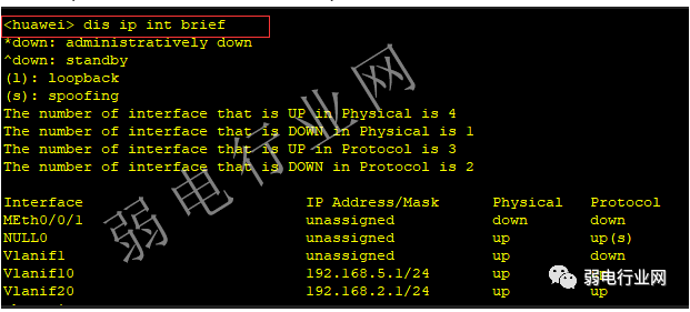 二、dis ip int brief 显示虚拟接口对应的 ip地址与使用状态。