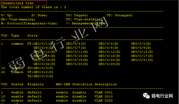 三、显示已经创建的vlan情况 dis vlan