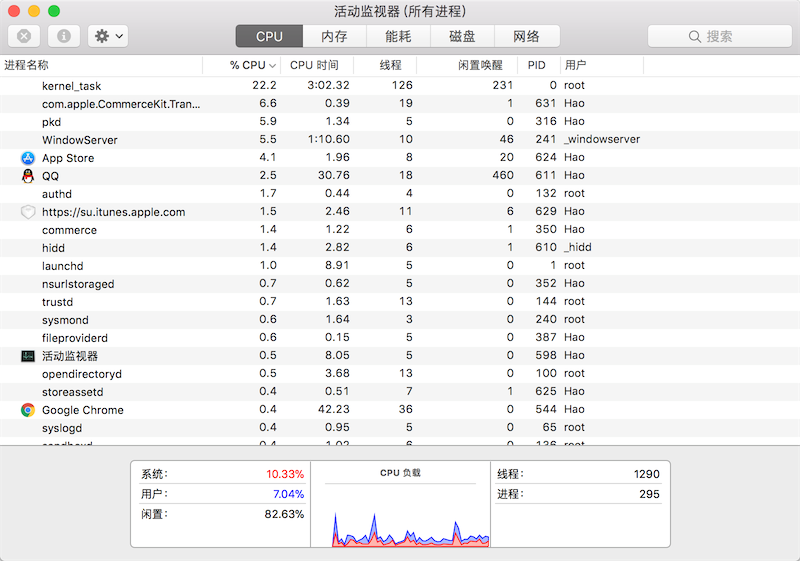 一个进程还可以拥有多个并发的执行线索,简单的说就是拥有多个可以获得CPU调度的执行单元,这就是所谓的线程。由于线程在同一个进程下,它们可以共享相同的上下文,因此相对于进程而言,线程间的信息共享和通信更加容易。当然在单核CPU系统中,真正的并发是不可能的,因为在某个时刻能够获得CPU的只有唯一的一个线程,多个线程共享了CPU的执行时间。使用多线程实现并发编程为程序带来的好处是不言而喻的,最主要的体现在提升程序的性能和改善用户体验,今天我们使用的软件几乎都用到了多线程技术,这一点可以利用系统自带的进程监控工具(如macOS中的“活动监视器”、Windows中的“任务管理器”)来证实,如下图所示。