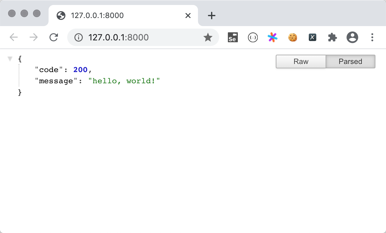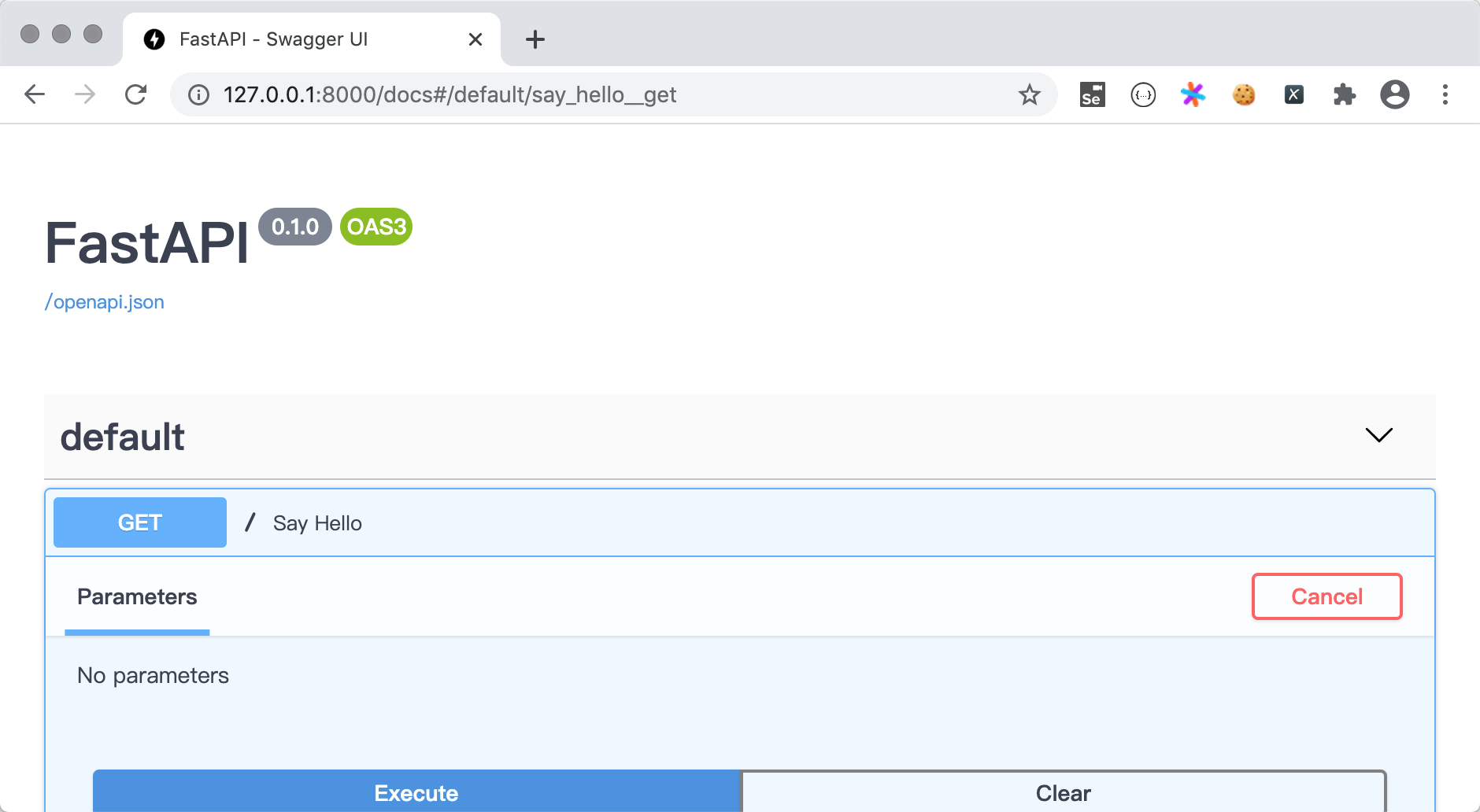 main.py。from fastapi import FastAPI app = FastAPI() @app.get('/') def say_hello(): return {'code': 200, 'message': 'hello, world!'} -